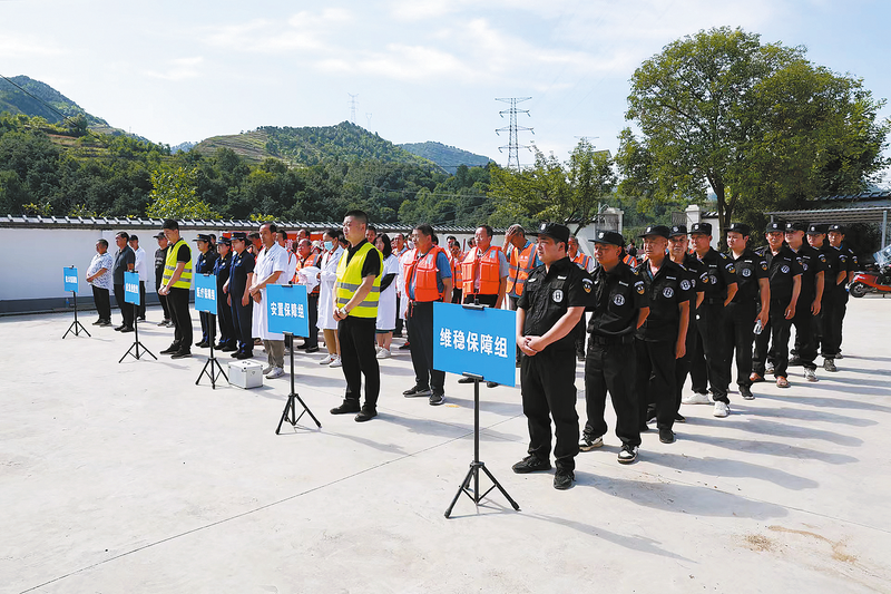 为提高基层干部群众防灾减灾意识和临灾避险能力,近日,丹凤县自然资源局联合各镇办在地质灾害点开展了系列防灾演练活动。图为龙驹寨街道模拟因连续降雨致宏岩铁矿尾矿库坝底出现裂缝开展的防灾应急演练活动。(本报通讯员 郑立傅 摄)