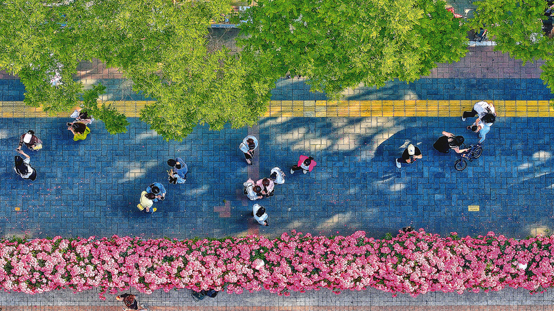 商洛学院门口的蔷薇花墙与绿荫相对,将街道装点成画。