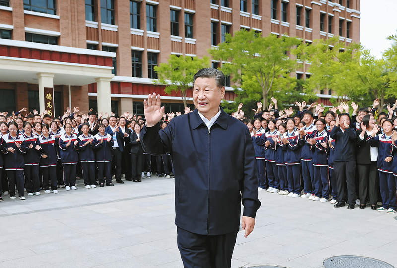 六月十八日至十九日,中共中央总书记、国家主席、中央军委主席习近平在青海考察。这是十八日下午,习近平在果洛西宁民族中学考察时,向师生们挥手致意。 (新华社记者 鞠鹏 摄)