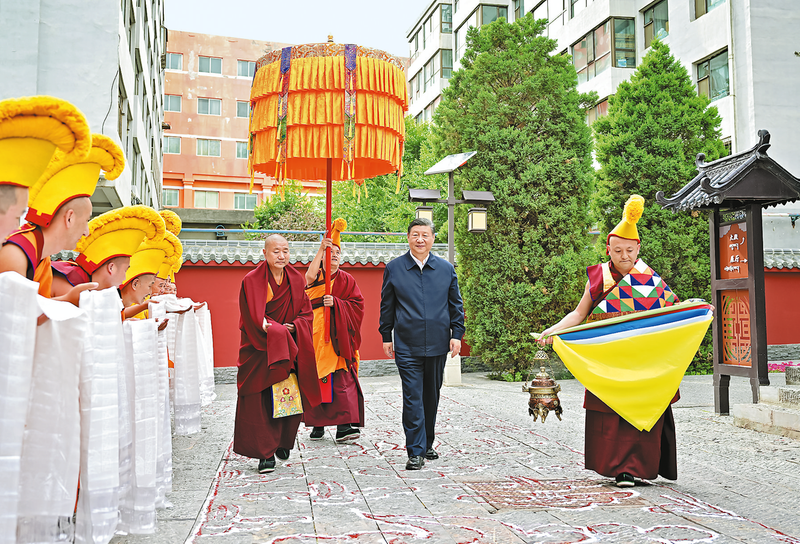 随后,习近平来到位于西宁市城中区的宏觉寺。在寺前院落,宏觉寺民主管理委员会负责人向总书记敬献哈达,僧人提香炉、持宝伞迎接总书记。习近平参观青海省民族团结进步教育基地展陈等,了解寺庙历史沿革、老一辈革命家关心推动民族工作和宗教工作的情况。他走进大殿,听取寺庙加强日常管理、促进民族团结进步等情况介绍。习近平指出,宏觉寺这座千年古刹,在增进历代中央政府与藏传佛教联系方面发挥了重要的桥梁纽带作用。要保护好这份珍贵的历史文化遗产,为铸牢中华民族共同体意识、促进民族团结进步作出新贡献。要向老一辈革命家学习,把新时代党的统战工作、民族工作、宗教工作做得更好。习近平强调,以中国式现代化全面推进强国建设、民族复兴伟业,需要全国各族人民包括广大信教群众团结奋斗。希望青海藏传佛教界弘扬爱国爱教优良传统,促进宗教和顺、社会和谐、民族和睦,在中国式现代化进程中发挥积极作用。