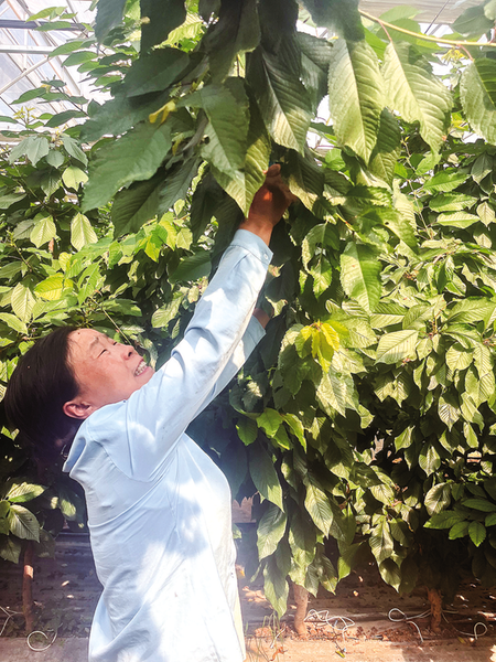 6月14日,商州区三岔河镇七星村村民在给大棚内的樱桃树剪枝。据了解,该村发展大棚樱桃52亩,共种植了近3万棵树,采取“农户+企业+村集体”模式,带动户均年增收2000元。 (本报记者 南 玺 摄)