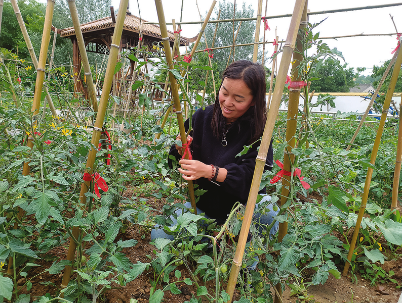 西红柿已经挂果,生菜叶嫩得能掐出水,黄瓜开出了金黄色花朵,南瓜蔓爬到了架子上,已结出了核桃大小的瓜。绵绵小雨也没挡住人们的劳动热情,“园主”有的给黄瓜苗搭架,有的拔除菜地边的杂草,有的在栽辣椒苗。