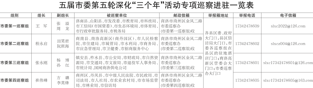 按照市委统一部署,2024年6月24日至7月19日,五届市委第五轮派出4个巡察组,对全市7个县区、商洛高新区(商丹园区)和32个市直部门(单位)党组织开展深化“三个年”活动专项巡察。