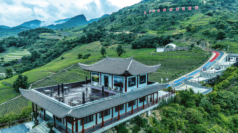 6月12日,山阳县户家塬镇户家塬社区的千亩茶园已是一片绿意盎然,空中俯瞰,一条宽阔绵延的产业路环抱茶园,茶叶加工厂、茶园观光带、观赏栈道、观光平台次第坐落在路边,正如户家塬社区茶产业不断延展的产业链条。