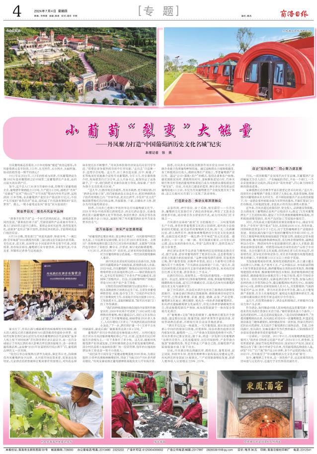目前,丹凤酒庄精品酒罐民宿、携程农庄、葡萄星球、丽呈别院、四皓养生馆、花筑荷塘畔等8家高端民宿建成运营,丹凤酒庄跻身国家3A级景区,三产实现联动增值发展,旅游人数和收入分别增长229%、237%。