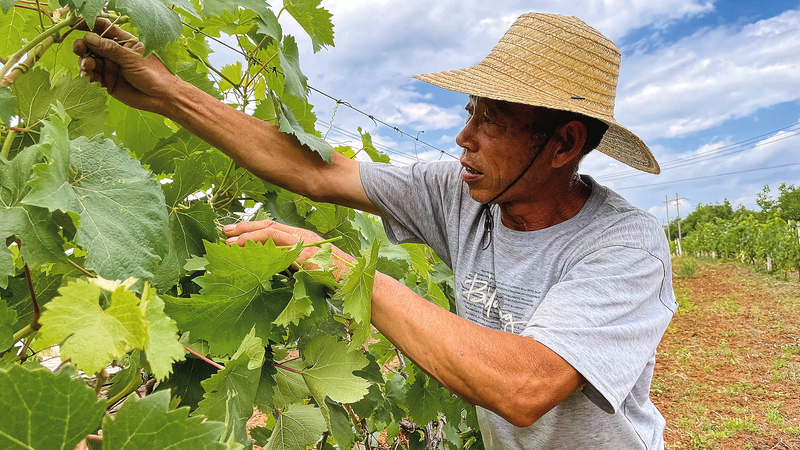 长期负责田间管理的陈军启就是其中一人。他从基地流转之初就在这里干活,主要负责葡萄种植管理、采摘、除草等工作。“以我的年纪外出打工很难找到工作,在基地干活每天能挣100元,工作强度不大,还能照顾家里。”陈军启对家门口的工作很满意。