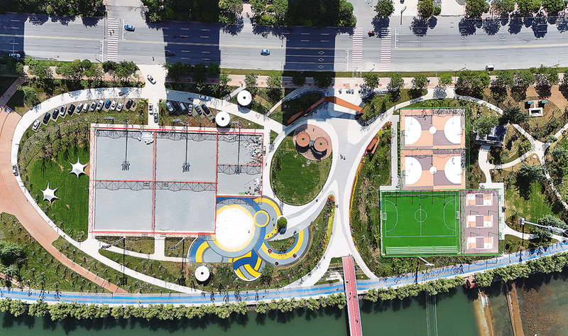 商州群众运动公园将运动与自然环境相融合,既保留了丹江公园原有的生态美景,又增加了丰富的运动元素,形成了集体育健身、赛事承办为主,融生态观光、文娱休憩、教育研学于一体的城市新空间。从城东带着孩子来玩的张女士说:“我平时在外县上班,只有周末才回家陪孩子。在手机上刷到新公园开放的消息后,我就带孩子特意来感受一下。孩子小学刚毕业,还带了乒乓球拍和同学早早约好来这里打乒乓球。我走了一圈,这里真的很有运动氛围,健身器材、排球场地还有足球场地等,设施齐全颜色也很漂亮,是孩子们运动的好去处,值得我向朋友们推荐。”