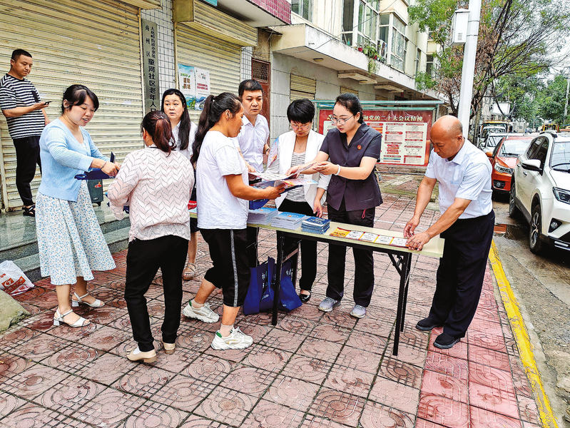 为进一步提高社区居民对《宪法》和《民法典》的认识和理解,7月10日,商州区人民法院速裁庭联合商州区大赵峪街道人大工委开展法治教育进社区宣传活动。 (本报通讯员 刘玉梅 摄)