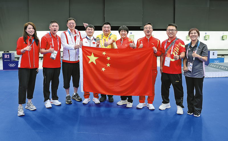 7月28日,冠军中国选手谢瑜(左四)和国际射联副主席、中国射击奥运冠军王义夫(中)等在颁奖仪式后合影。当日,在法国沙托鲁举行的巴黎奥运会射击男子10米气手枪决赛中,中国选手谢瑜夺冠。 (新华社记者 赵丁喆 摄)