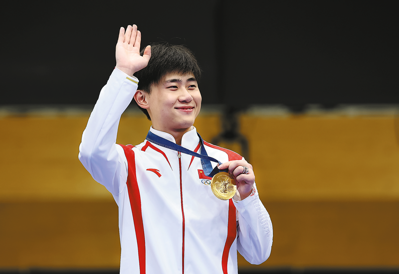 8月1日,冠军陕西籍选手刘宇坤在颁奖仪式上。当日,在法国沙托鲁举行的巴黎奥运会射击男子50米步枪三姿决赛中,陕西籍奥运健儿刘宇坤夺得冠军。 (新华社记者 张 帆 摄)