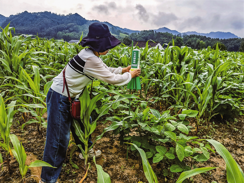 7月28日,农技人员在商南县试马镇毛河村大豆玉米带状复合种植基地调查监测田间病虫害情况。近期连续强降雨,使商南县农业产业不同程度受灾,县农业农村局抽调10名农业技术人员,组建3个专家组,巡回10个镇(街道)指导群众开展农业灾后自救、排涝扶正、改种秋季蔬菜,指导群众对农作物开展科管、追肥,尽量减少损失。 (本报通讯员 代绪刚 摄)