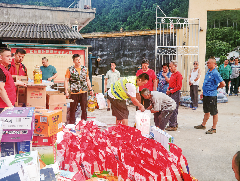 △8月1日,陕西省慈善协会1885公益服务队联合社会爱心人士,为商州区杨斜镇海棠岔村受灾村民送去65份米面油、62床被子、95公斤红薯以及牛奶、方便面、饮用水等总价值2.5万元的生活物资,以帮助当地群众顺利过渡,早日重建家园。 (本报记者 杨 鑫 摄)