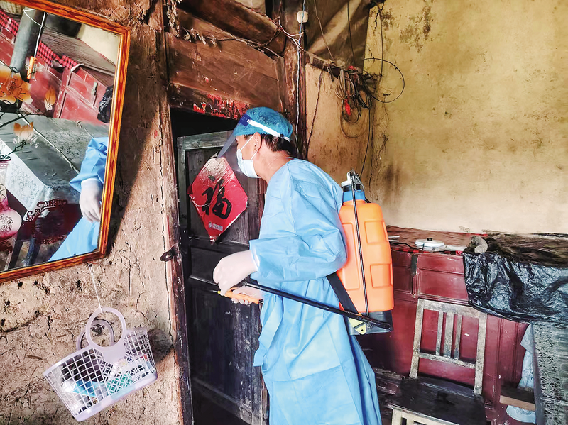 ▷连日来,洛南县保安镇组织医疗卫生系统相关工作人员进村入户开展防汛消杀工作,对所有受洪水漫灌的地段以及群众房屋进行彻底消毒,并给群众发放高锰酸钾、84等消毒产品,详细讲解消毒液配置、使用方法和注意事项,指导村民积极跟进消毒工作,向群众普及汛期后卫生防疫知识。 (本报通讯员 杨开让 摄)