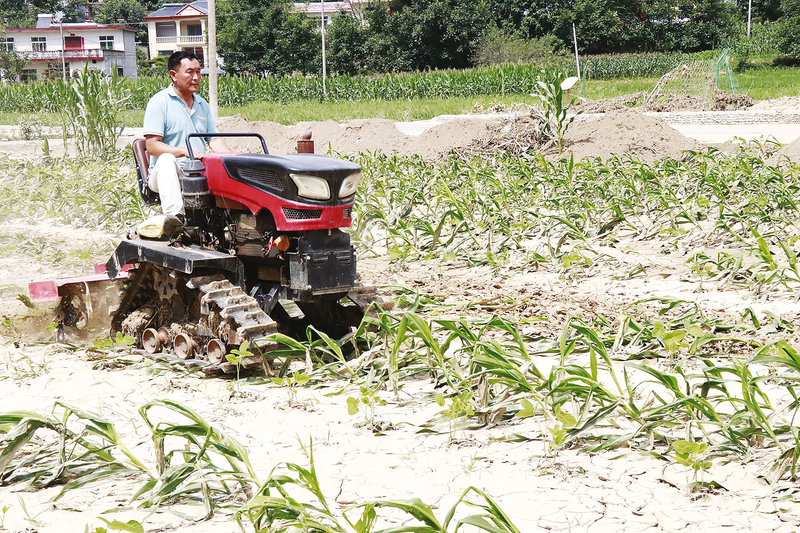 7月28日,山阳县农技中心工作人员在色河铺镇桦栗沟村指导农户做好灾后恢复和生产自救,并提供技术和物资支持,帮助农户开展田间排涝、补损补种。图为农技人员将被洪水淹过的玉米秸秆打碎还田。(本报见习记者 杨若阳 摄)
