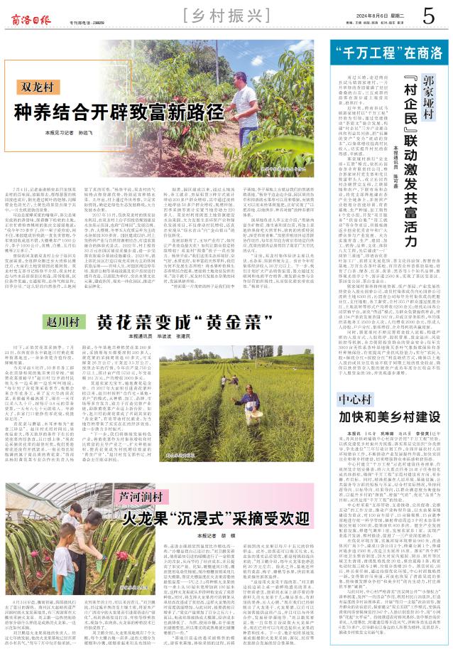 2017年10月,包扶双龙村的镇安县水利局,在双龙村上台子组投资规划建设水杂果示范园,也称“百味园”,发展以桃、李、杏、大樱桃、冬枣五大优质品种为主的水杂果园300多亩。园区建成以后,村上坚持将产业与自然资源相结合,打造农旅融合的体验式景点。2022年,村上投资30万元在园区铺设采摘步道,进一步完善农旅融合基础设施建设。2023年,镇上依托园区打造以观光采摘为主的休闲农旅品牌——百味人生,对园区周边停车场、旅游公厕等基础设施及农户房屋进行提升改造,以庭院为单位,突出水果文化元素,建成休闲、观光一体化园区,推进产业品牌化。