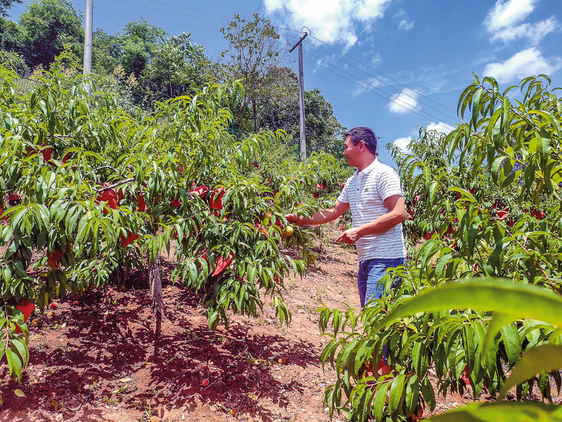 耳边是蜜蜂采蜜的嗡嗡声,鼻尖是果实成熟的香甜味,踩着脚下松软的土地,正在忙着检查桃树的张庆文缓缓地说:“我今年70多岁了,但一辈子爱劳动,闲不住,果园建成后我就一直负责管理,今年果园收成还不错,大樱桃年产1000公斤,李子1000公斤,黄桃、白桃、五月仙桃等2万多斤。”