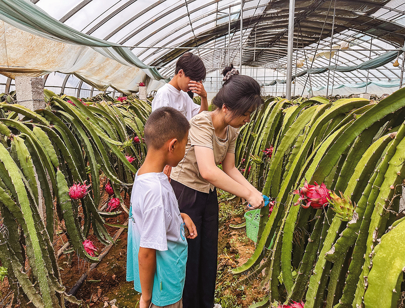 “这是用火龙果干泡的茶。”刘卫鹏边说边端上桌一壶鲜艳透亮的茶水。仔细看壶里,能看到水面上漂浮着的带着籽儿的火龙果干儿;细品茶水,有甜甜的果香,沁人心脾。“现在我们已经研制出了火龙果干、火龙果酒,以后可以向游客提供这些产品,并且可以与外界合作,发展研学基地等。”刘卫鹏笑着说,他一直在想方设法做大火龙果产业,现在已经可以向周边提供火龙果的种苗和技术。下一步,他计划将基地发展成能提供火龙果采摘、游玩、民宿等农旅融合发展的综合性基地。