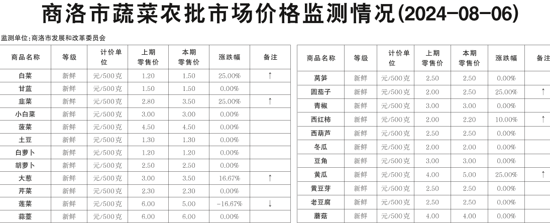 商洛市蔬菜农批市场价格监测情况(2024-08-06)