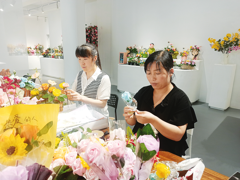 今年以来,洛南县保安镇积极学习运用“千万工程”经验,结合本地实际,打造了非遗一条街,并引进商洛德瑞宝实业有限公司。该企业主要生产销售香皂花原料及配件、香皂花、PE仿真花等,创造就业岗位100多个,带动周边易地搬迁户、脱贫户、残疾人、留守妇女及农村富余劳动力2000多人稳定就业。图为8月4日,在匠心皂花门店内,务工人员正在学习制作PE仿真花。 (本报通讯员 毕波波 摄)