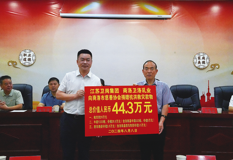 △8月8日,江苏卫岗集团与商洛卫洛乳业两家爱心企业向商洛市慈善协会捐赠抗洪救灾物资。据悉,两家爱心企业共捐赠抗洪救灾款物44.3万元,其中救灾款20万元,牛奶1333箱价值20.8万元,其他物资3.5万元,这些救灾物资分别送往洛南、镇安、商南、丹凤等地。 (本报记者 米子扬 摄)