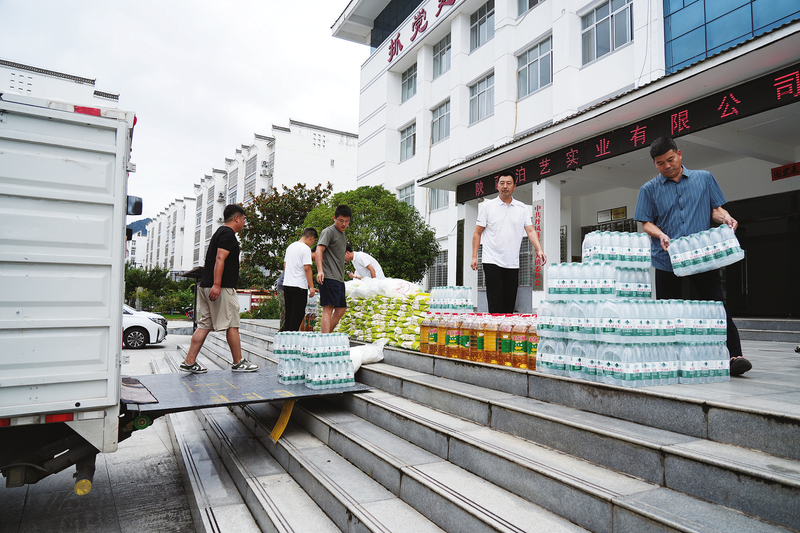 △8月9日,陕西泊艺实业有限公司走进丹凤县竹林关镇开展防汛物资捐赠活动,共捐赠食用油100桶、大米100袋、面粉100袋、矿泉水100件,以实际行动为竹林关镇防汛工作贡献了一份力量。