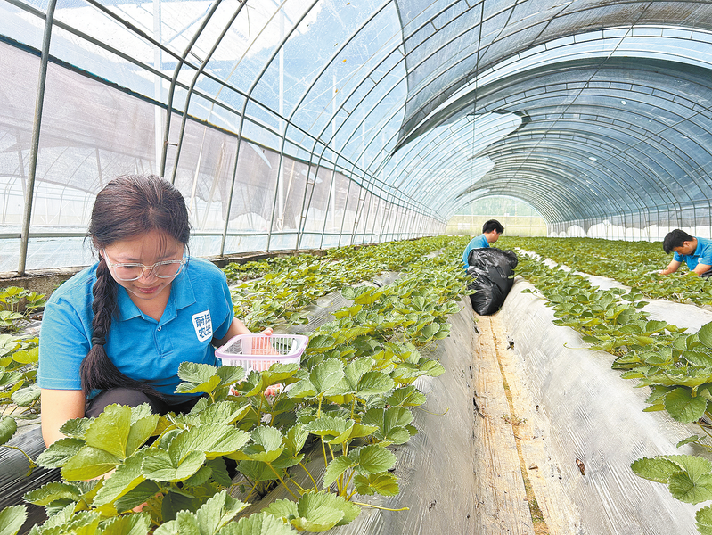 8月9日,位于洛南县保安镇仓圣社区的现代化科技创新种业示范基地内,工作人员对夏季甜草莓进行田间管理。该基地引进新加坡夏季甜草莓等10余个知识产权专利种子新品种,应用国际先进生物育种技术,结合前沿智能温室管理系统,研发试种甜草莓、藏红花等高端经济作物,构建集种子源头到规模种植、果蔬加工、冷链运输、订单销售于一体的科技型农业产业体系,打造县域农业科技产品新名片。 (本报记者 肖 云 摄)