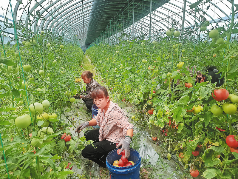 今年以来,洛南县城关街道刘涧社区积极学习运用“千万工程”经验,结合社区实际,二期新建成温室大棚12座,主要种植西红柿、圣女果等果蔬,预计年产值12万元,社区集体经济增收3.6万元。图为8月10日,在刘涧社区农业产业园内,务工群众正在采摘西红柿。 (本报通讯员 毕波波 摄)