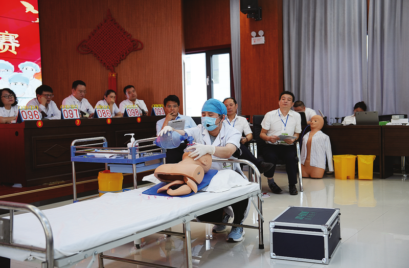 8月14日,在第7个“中国医师节”到来之际,镇安县医院组织开展以“崇尚人文精神,彰显医者仁心”为主题的临床医师技能竞赛活动。活动通过理论知识答题、技能现场比拼等方式进行,以此展现了医护人员良好的精神风貌、丰富的知识储备、过硬的技术功底。 (本报通讯员 符明月 摄)