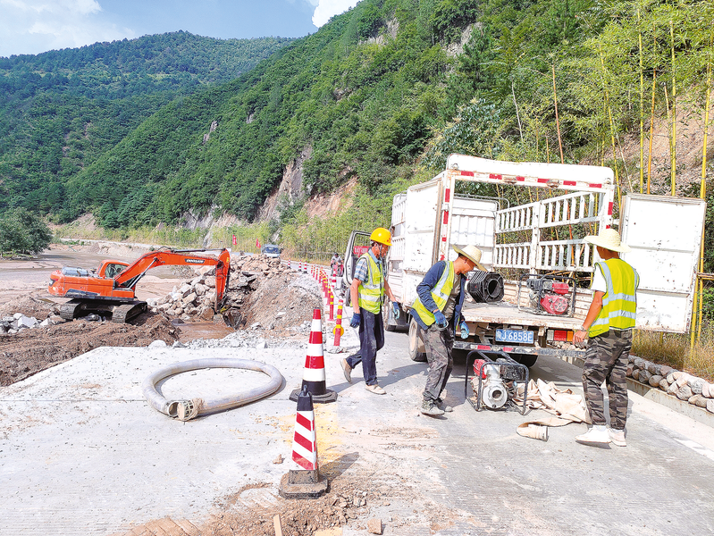 8月17日,柞水县曹坪镇组织交通应急保障队伍对水毁道路进行维修、对路肩及防洪坝进行加固,消除道路安全隐患,全力保障群众出行安全。 (本报见习记者 孙远飞 摄)