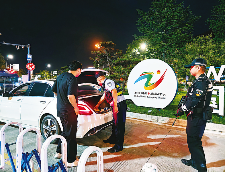 8月10日晚,柞水县公安局巡特警大队民警在桃园公安检查站设卡盘查过往车辆和司乘人员。 (本报通讯员 李武群 摄)
