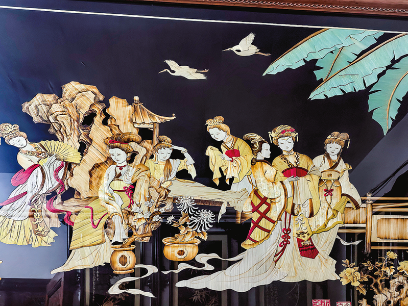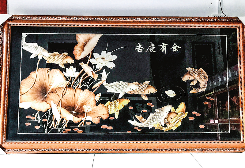 走进“王聪芳麦秆画”工作室,狭窄的空间略显逼仄,靠墙放着的、挂着的,各种各样金灿灿的麦秆画作品摆满了整个工作室,让人目不暇接。从花鸟鱼虫到人物故景,从四季风景到民俗故事,一幅幅图案惟妙惟肖,一个个人物呼之欲出。俯身细看,这些麦秆画作品技法十分细腻,鱼的鳞片、蝴蝶的翅膀、仕女图上女子的表情形态等都被一一刻画出来,与其说是麦秆画,不如称是一幅精美的工笔画。
