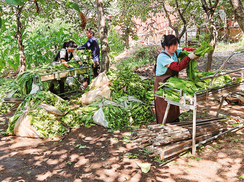 8月21日,洛南县景村镇御史村村民将刚采摘的烟叶装上夹子准备烘烤。据了解,近期已进入烟叶采摘季,在洛南县随处可以看到种植户采摘和烘烤烟叶,烤烟已经成了当地的主导产业之一。 (本报记者 杨 鑫 摄)