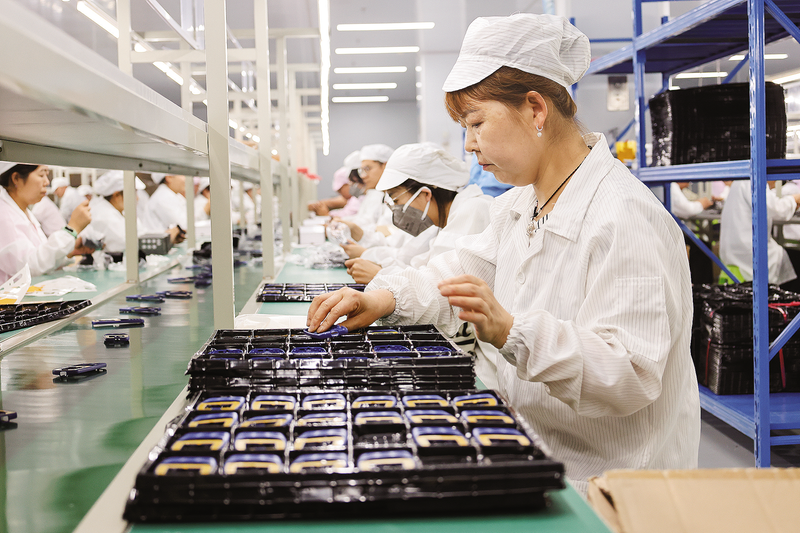 8月19日,工人在商州区电子科技产业园陕西汇宇智能科技有限公司生产线上组装手机。据了解,该公司建设有移动通信终端产品装配自动化生产线、自动化包装线以及平板电脑装配车间,产品主要销往中东、东南亚、南美洲等地。 (本报记者 王江波 摄)