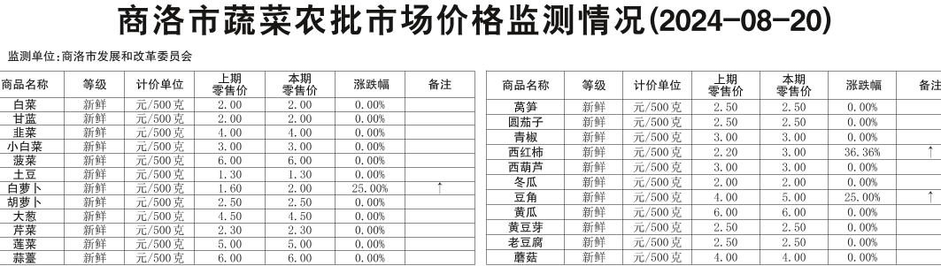 商洛市蔬菜农批市场价格监测情况(2024-08-20)