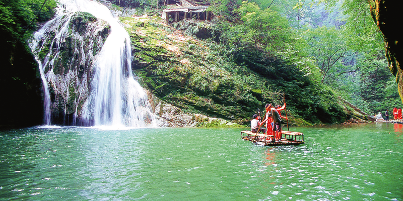 游客在金丝峡景区锁龙瀑布下泛舟“一年有四季,季季景不同。青山镇已形成‘春赏紫荆夏避暑,秋观红叶冬滑雪’的四季旅游格局,来自河南、湖北、西安等周边省市的游客纷纷到这里度假旅游,每年游客接待量超30万人次。”8月13日,商南县青山镇政府相关负责人说。