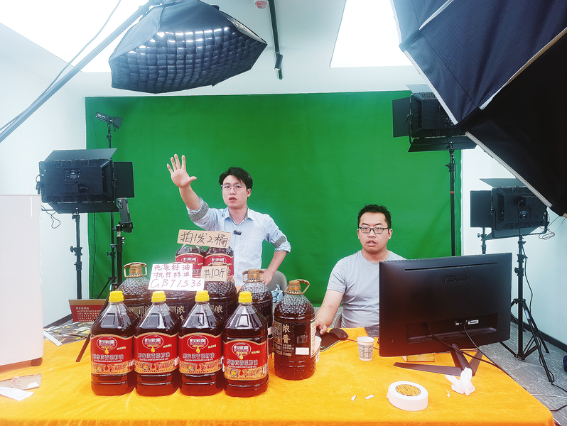 今年以来,位于洛南县的西北核桃物流园探索建立“联得紧、带得稳、能长久”的联农带农长效机制,吸引原乡记忆、阳光菌业、奶盐网络科技等5家电商企业入驻,助力洛南当地农特产品走向更广阔的市场,带动周边群众持续稳定增收。图为8月21日,电商企业员工正在直播销售洛南农特产品。 (本报通讯员 毕波波 摄)
