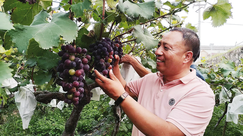 近日,洛南县三要镇永坪村股份经济联合社葡萄基地里的葡萄陆续成熟,该基地共50亩,种有阳光玫瑰、户太八号、蜜蜡皇后等品种,深受市场青睐。图为8月27日,游客在基地采摘抢鲜上市的葡萄。 (本报通讯员 毕波波 摄)