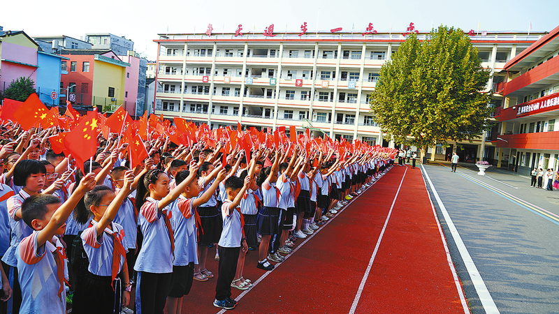 9月1日,丹凤县第五小学全体师生齐聚在操场,共同举行新学期第一次升旗仪式。仪式上,少先队员代表分享了中国奥运健儿的榜样故事,希望队员们从“奥运精神”中汲取成长力量,在新学期坚持梦想,勇于攀登,创造出属于自己的高光时刻。 (本报通讯员 田 兵 摄)