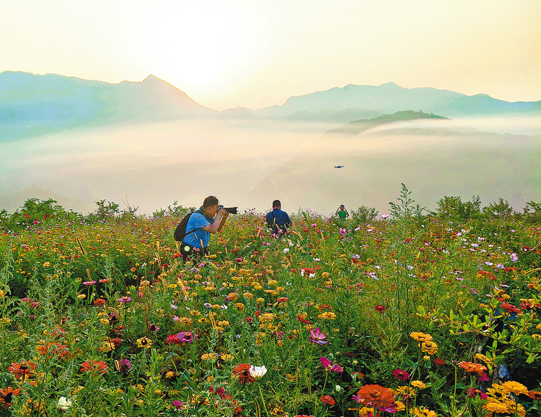 初秋的镇安县海棠山,日出、花海、雾海交织在一起相互映衬,构成了一幅如梦似幻的画卷,让人沉醉其中,流连忘返,吸引了西安等地不少游客前来观赏拍照。