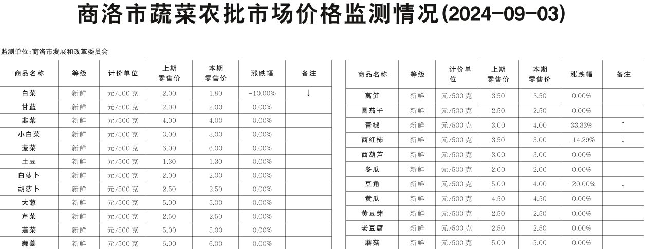 商洛市蔬菜农批市场价格监测情况(2024-09-03)
