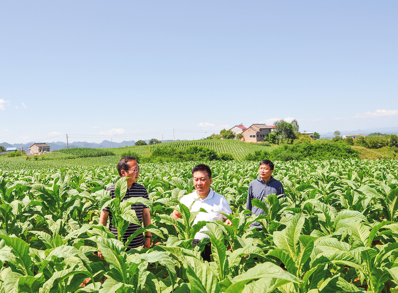 商洛市烟草专卖局(公司)党组书记、局长、经理洪炜(中)在洛南县四皓街道药王村烤烟基地察看大田烟叶长势