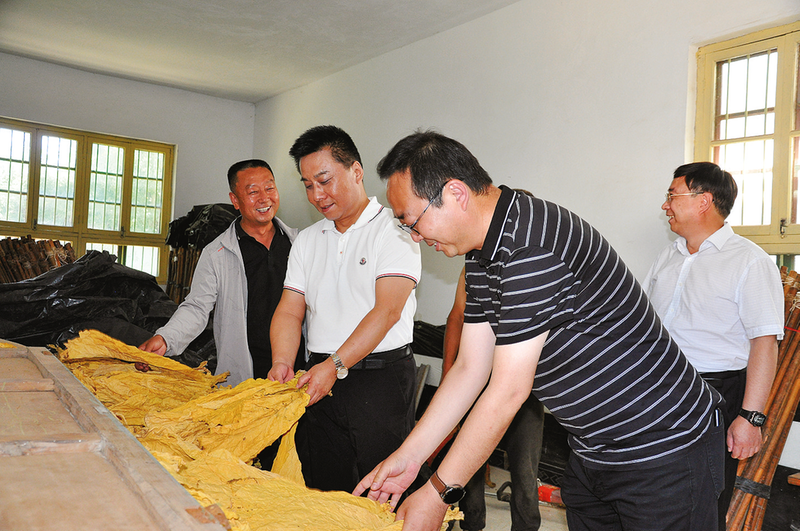 商洛市烟草专卖局(公司)党组书记、局长、经理洪炜(前排中)在洛南县永丰镇马洼村烟农家中察看刚出炉的烟叶质量