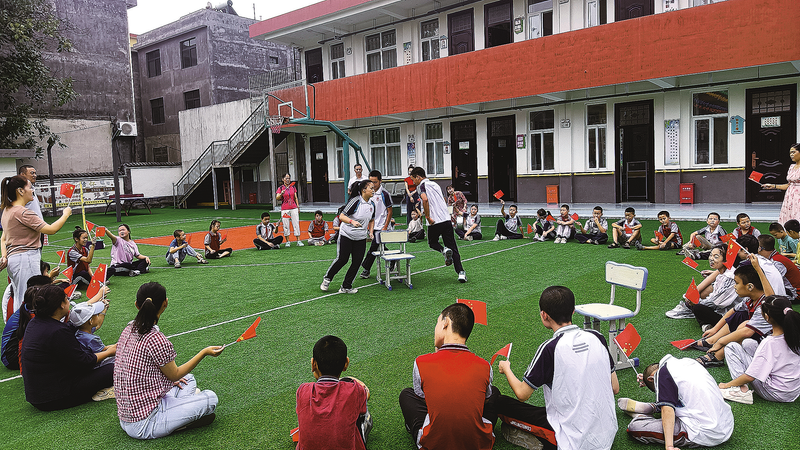 近期,丹凤县特殊教育学校新学期利用早操、康训活动时间,将“抢凳子”“击鼓传花”等游戏和特教学生培智、康复运动相融合,培养学生的团队合作精神和思维能力。 (本报通讯员 郑志财 摄)
