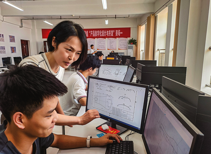 阳光热烈,洒在镇安县职业教育中心的校园里,泛起一片金黄。9月2日下午,最后一节课下课铃声响起,8楼实训教室里的师生仍未离开。轻轻推门,只见曹先娉俯身,一只手轻轻地搭在一位同学的肩上,另一只手指着电脑屏幕,神情专注而认真地说:“注意这里,先点击这个图标,然后选择这个选项。”