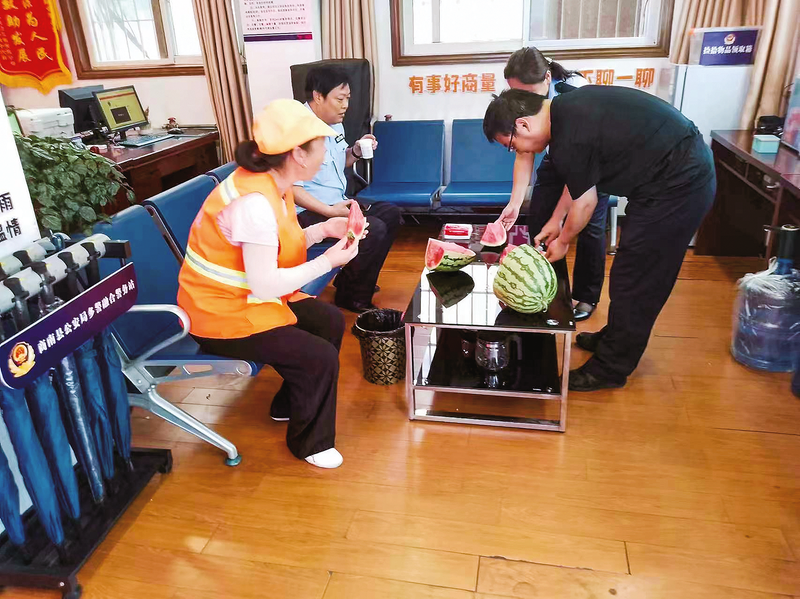 “冯姨进来坐,我给您拿报纸,边看边喝茶。”值班民警老刘热情地招呼着。8月20日16时许,冯某来到“暖心警务会客厅”,手上拿着印有“雨雪纷纷下单鹿警为您送伞”字样的雨伞,微笑着说:“前几天回家时雨太大了,路过这儿时,民警借给我了一把伞,今天特意来归还,谢谢你们。”冯某是这儿的“常客”,因征地拆迁等问题,多次向相关部门反映情况,每次值班民辅警在得知情况后,将其接到“暖心警务会客厅”,动之以情、晓之以理,耐心讲解相关法律法规,劝说其要文明理智维权,依法依规信访。后来,大家也逐渐熟络起来,有时民辅警在街上巡逻时遇见她就邀请到“暖心警务会客厅”坐坐,聊聊家常。