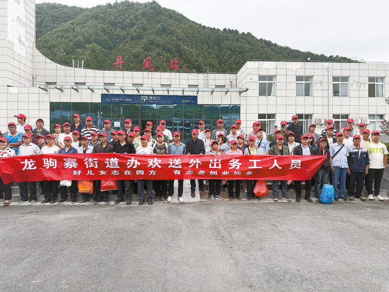 为认真落实中央和省、市、县“稳就业、保民生”的政策要求,9月10日,丹凤县龙驹寨街道办在火车站为79名赴内蒙古务工人员举行“劳务输出”欢送仪式,现场发放“爱心包”,为群众“出家门、上车门、进厂门”提供便利和保障。(本报通讯员 韩 淋 摄)