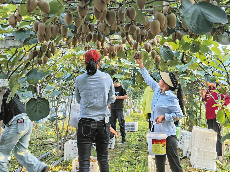 9月22日,务工人员在丹凤县棣花镇许家塬村的商洛果耘艺农林科技有限公司猕猴桃基地内采摘猕猴桃。据悉,该基地经过5年发展,年创收入50多万元,保障村里季节性务工人员20多人,人均年增收1万多元。 (本报记者 贾书章 摄)