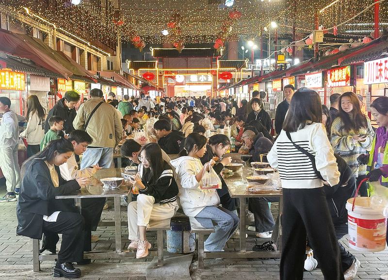 10月4日,夕阳西下,西背街美食城里座无虚席,许多摊点前都站满了顾客。烧烤摊点老板杨存良手里不停地翻动着鱿鱼串,撒上秘制调味料,美食的香味迅速弥漫开来。杨存良笑呵呵地说:“放假这几天,每天都能卖2000多串,基本上不到10点就打烊。”隔壁摊点的一位老板也连连笑着说:“真希望,天天生意都这么好!”