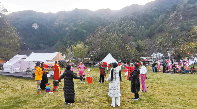 10月2日,洛南县保安镇亲农·溪乐谷景区游客众多,热闹非凡。在景区的帐篷露营区域,游客沉浸在欢快的氛围中,载歌载舞,为保安镇乡村旅游发展带来蓬勃生机。 (本报记者 张 英 摄)
