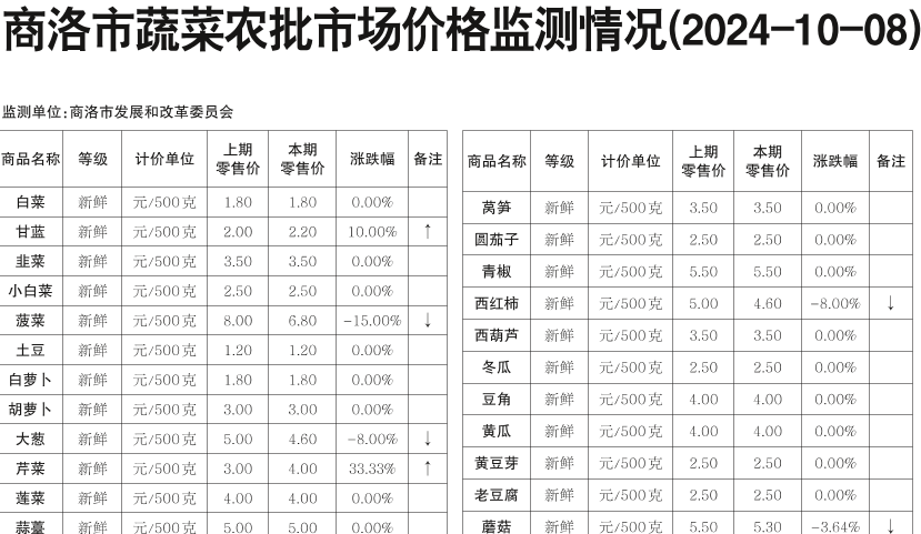 商洛市蔬菜农批市场价格监测情况(2024-10-08)